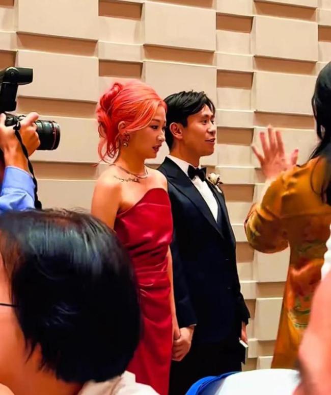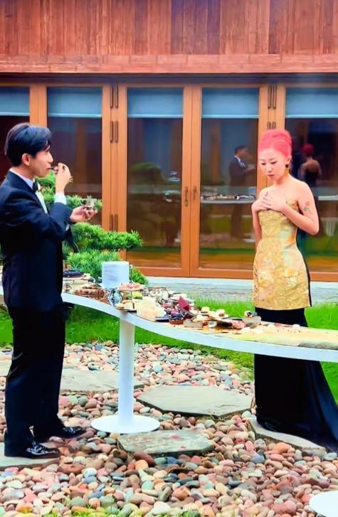 新人非常引人注目,尤其是刘一丝,一头红发,发尾微卷,纹身若隐若现。她的三套礼服风格截然不同:中式抹胸绣花礼服、白纱婚纱、金色典雅礼裙,个性十足。新郎全程西装笔挺,身材与刘一丝非常般配,长相儒雅,看起来相当老实可靠。仪式流程分中式和西式部分,既保留了传统的仪式感,也融入了现代的浪漫。