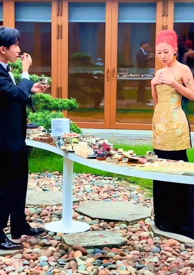 这对新人站在装饰着鲜花的小桥上合影时,新郎始终细心地为妻子整理裙摆,举手投足间流露出自然的绅士风度,两人在长桌前共同切下婚礼蛋糕的画面,更是被宾客频频举起手机记录,周围摆放着茅台酒与进口红酒,无声诉说着两个家庭对这场联姻的重视。