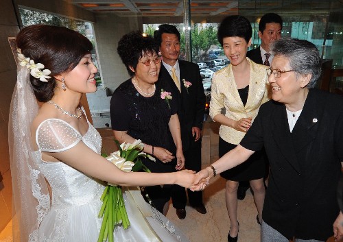 5月16日,江苏省红十字会会长吴锡军(右一)来到婚礼现场向新娘邱媛媛送上祝福。新华社记者 孙参 摄
